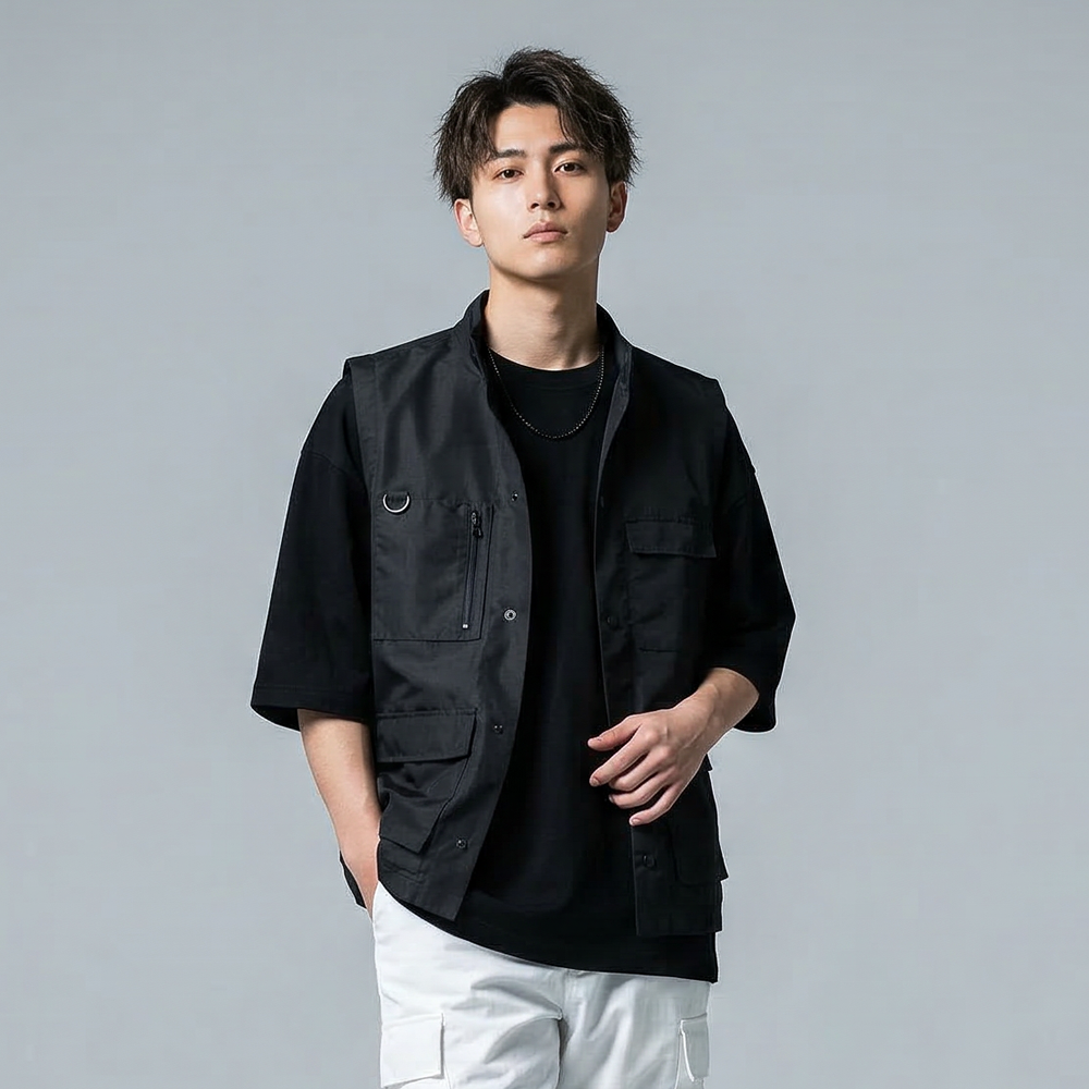 少し長めの丈でさらっと羽織れるユーティリティーカーゴベスト。収納力のある大き目のフラップポケットを3つと「瞬時にバッグやサコッシュに変身!」