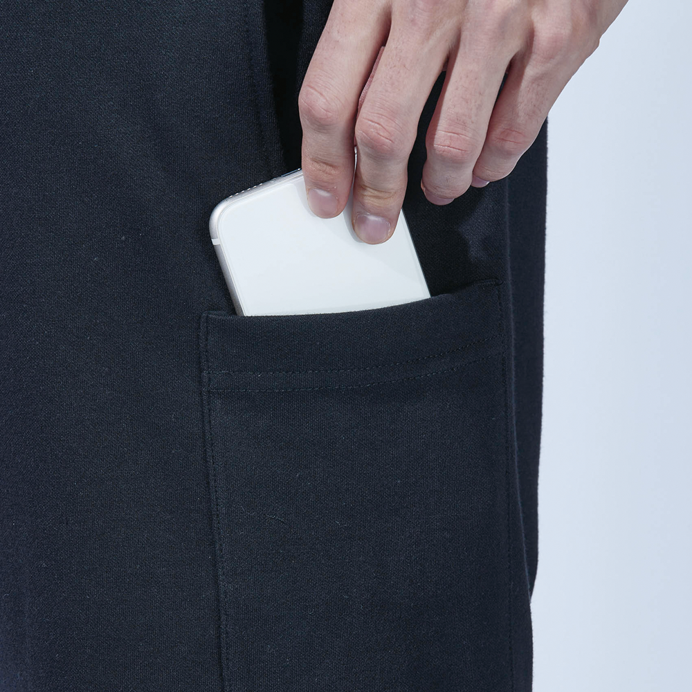 サイドポケットは、スマホの収納に最適で、しゃがんだり足を上げた際も落ちにくい仕掛けになっている。