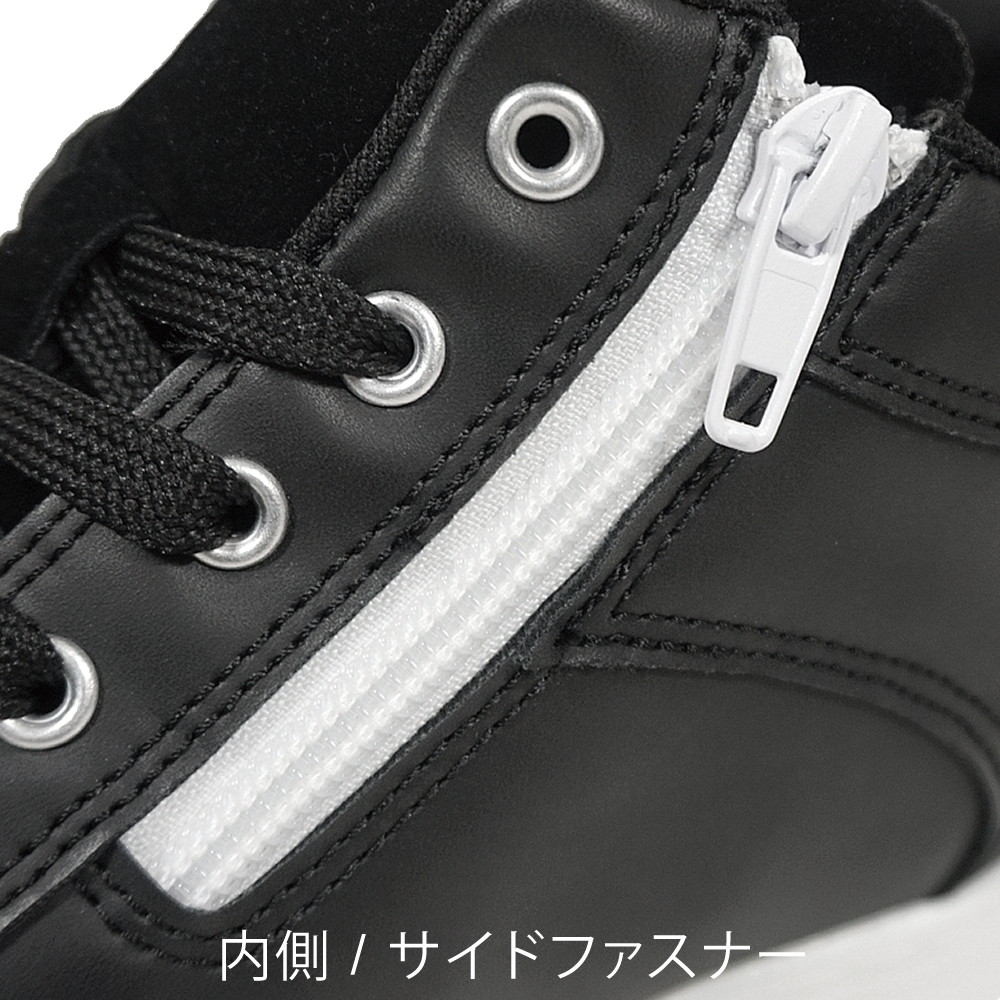 ミドルカットならではの着脱時の煩わしさをファスナーで解消。靴紐の結び直しが必要なく、楽に脱ぎ履き出来る。